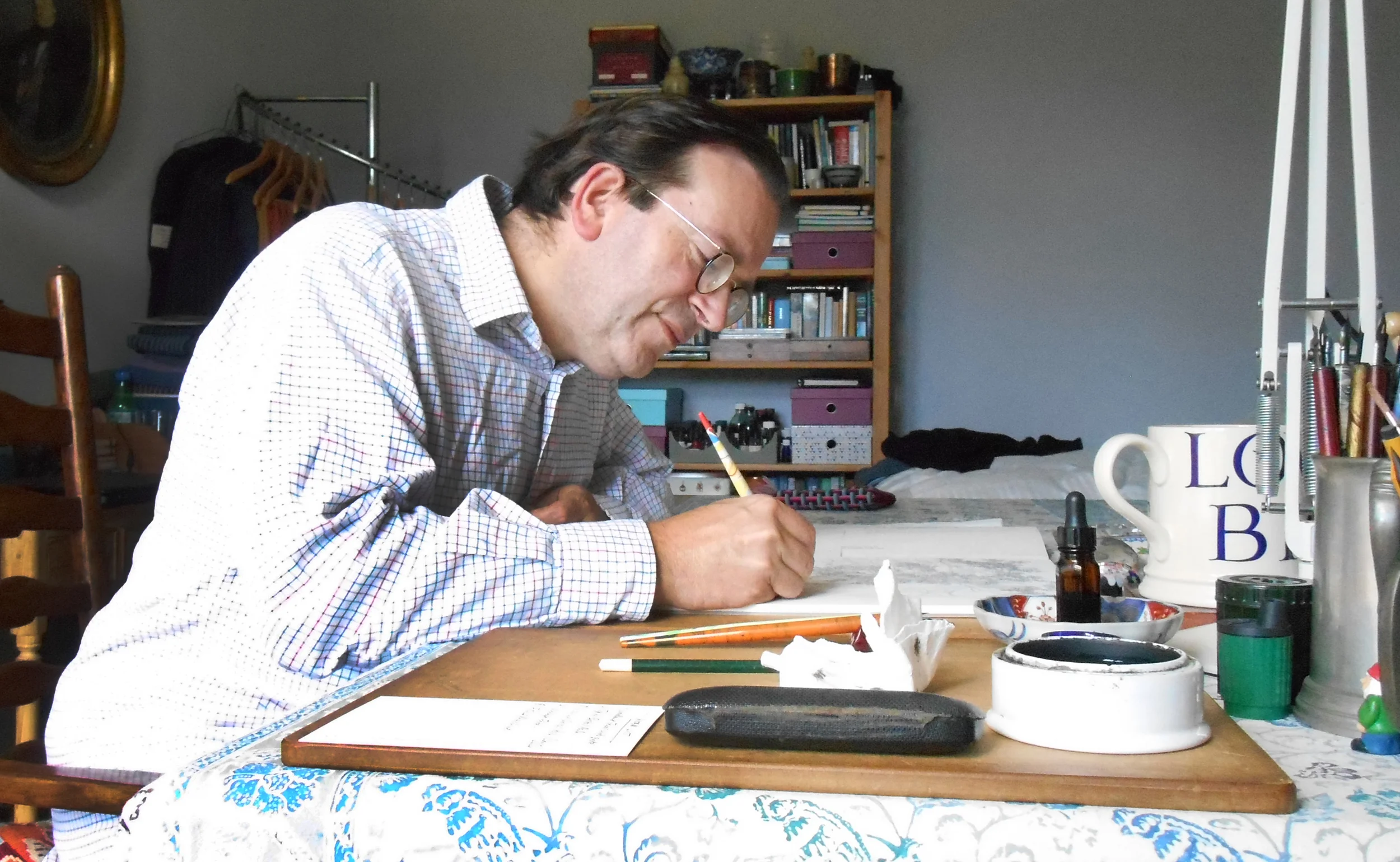 Until recently, he lived and worked in Selborne, Hampshire, exhibiting his drawings and watercolour landscapes locally and helping to run the Selborne Gallery. In June 2015 he moved to South Devon and now lives near Kingsbridge. A largely self-taught artist, he has been fortunate enough to receive many commissions, both for conventional watercolours and for whimsical, often anachronistic cartoons – his speciality since childhood, when a fascination with old machinery, old cars and everything unusual or eccentric inspired his early flights of imagination on paper.